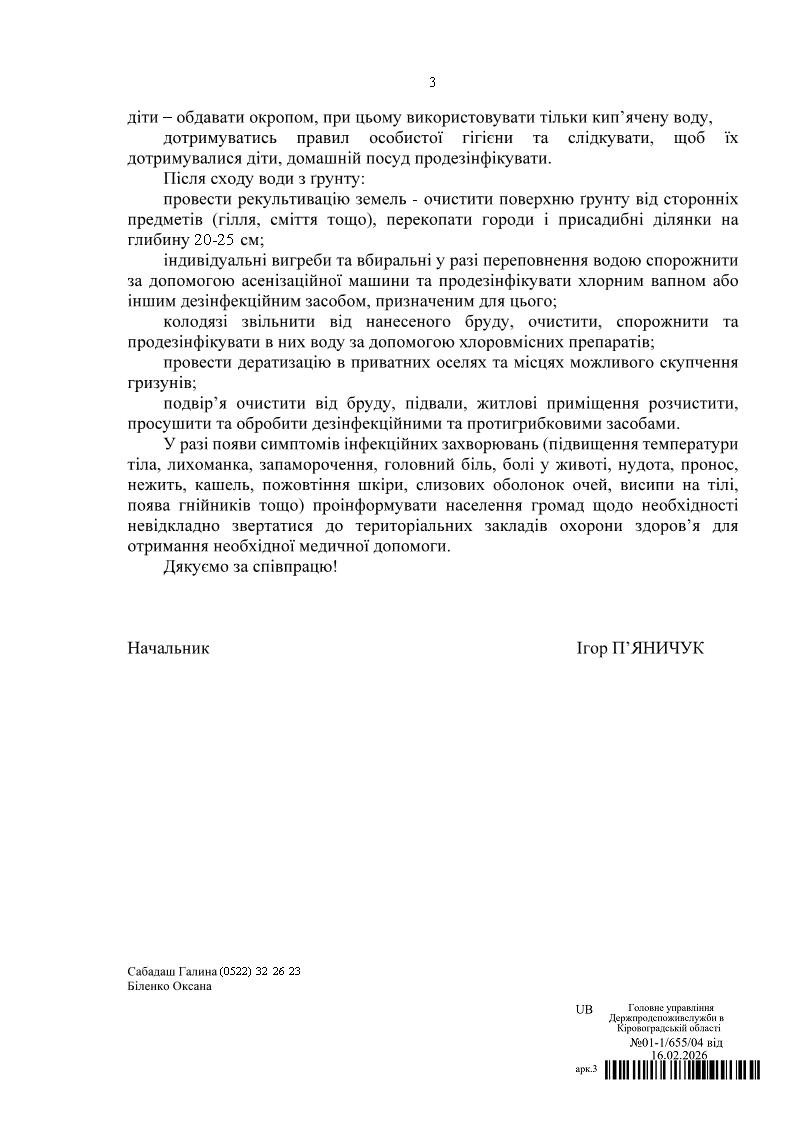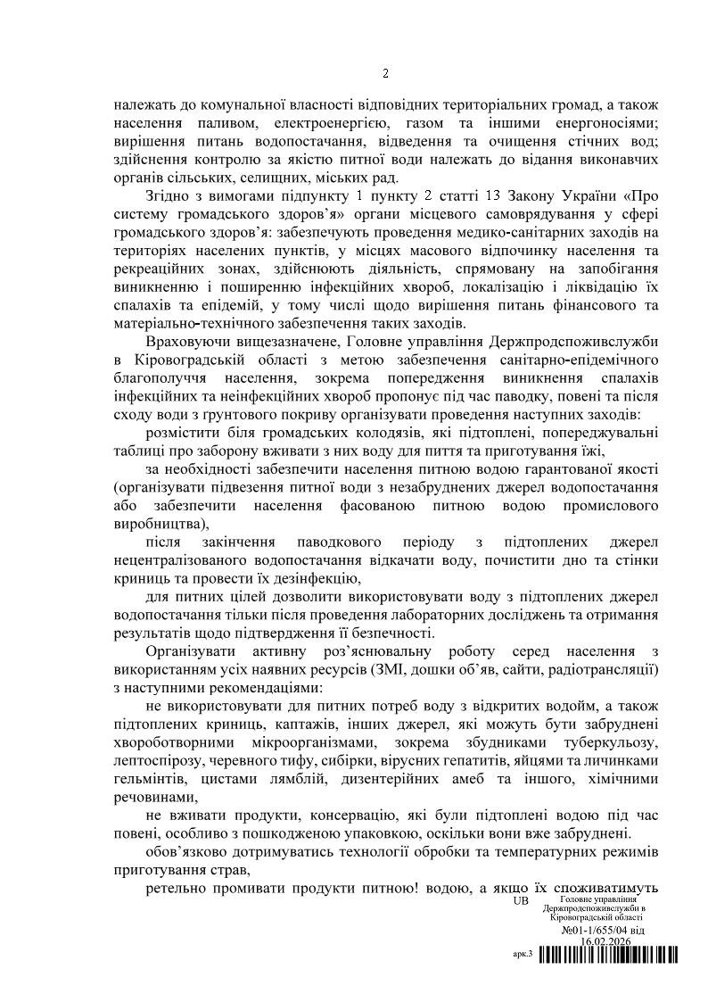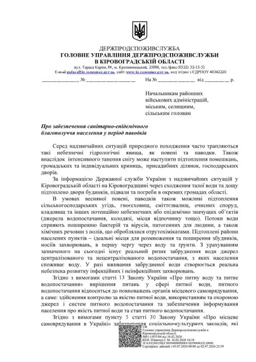 Відповідно до листа Головного управління Держпродспоживслужби в Кіровоградській області та у зв’язку з можливими паводками та підтопленнями на території громади, з метою недопущення виникнення інфекційних захворювань та збереження здоров’я населення, Добровеличківська селищна рада інформує про необхідність дотримання санітарно-гігієнічних вимог.