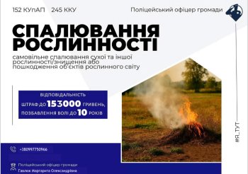 📑за статтею 77-1 (Самовільне випалювання рослинності або її залишків) КУпАП громадянам загрожує штраф від 3060 до 6120 гривень, а посадовим особам — від 15 300 до 21 420 гривень.