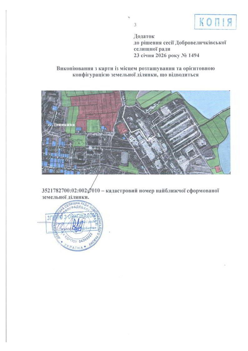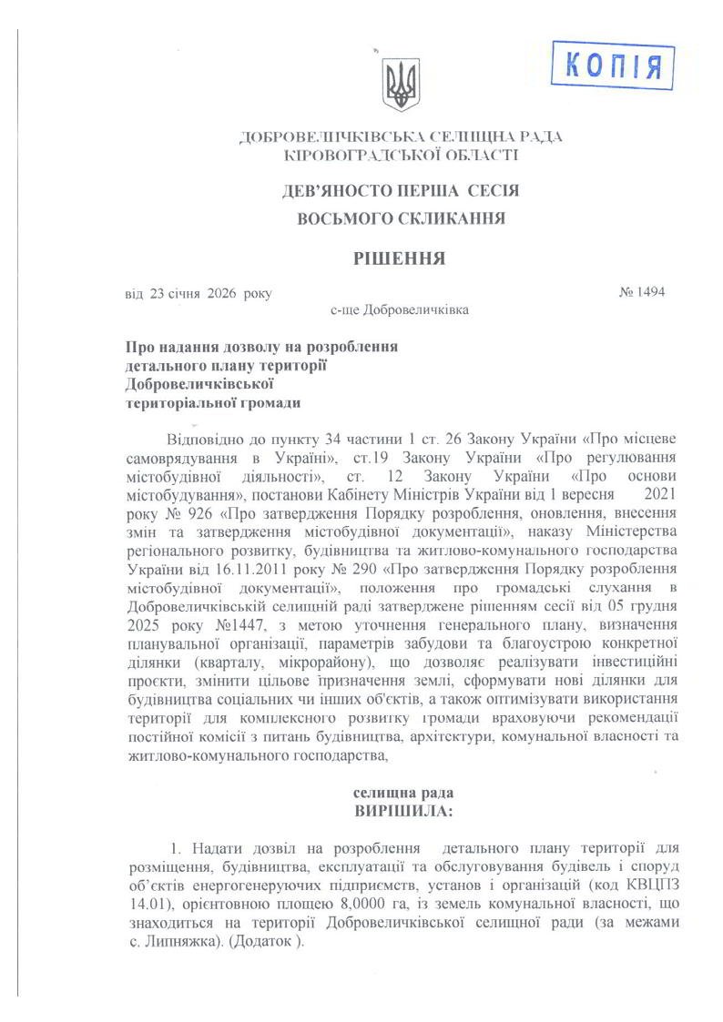 Рішення Добровеличківської селищної ради від 23 січня 2026 року № 1494 "Про надання дозволу на розроблення детального плану території Добровеличківської територіальної громади" - rshennya.pdf