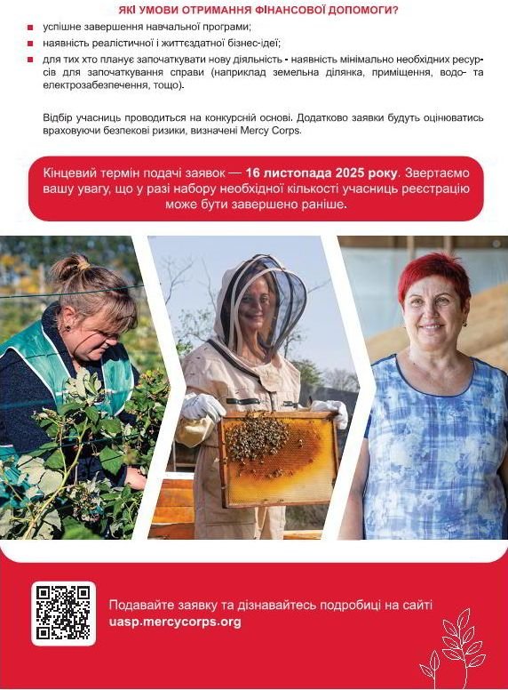 |  В рамках Програми підтримки сільського господарства України, яка втілюється міжнародною гуманітарною організацією Mercy Corps за фінансової підтримки Фонду Говарда Г. Баффета, відкрито прийом заявок на участь у новому компоненті програми, спрямованому на  навчання та фінансову допомогу  підтримки жінок-фермерок.