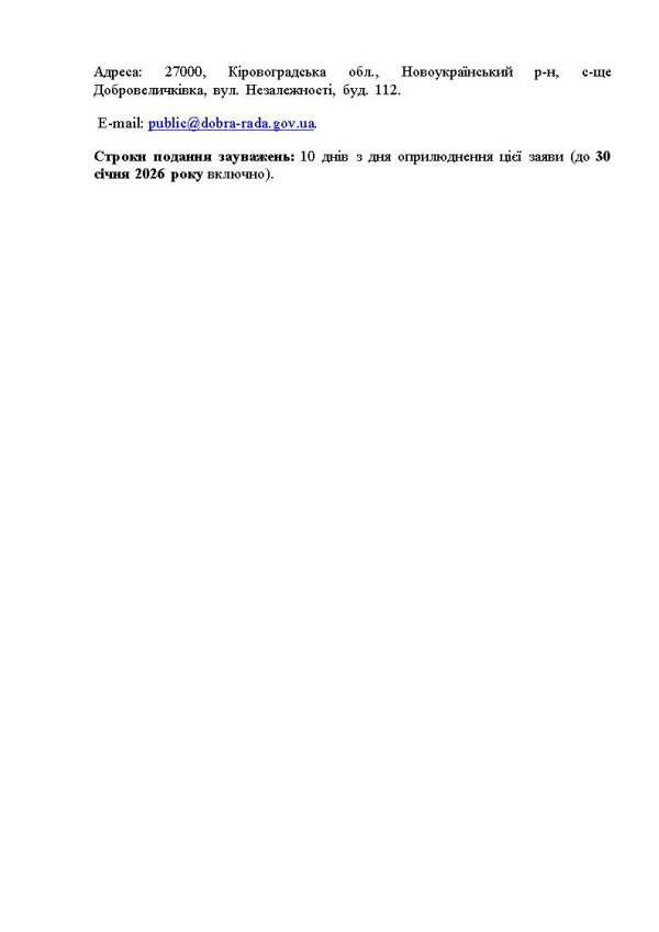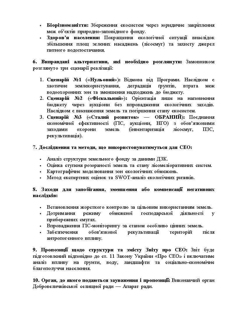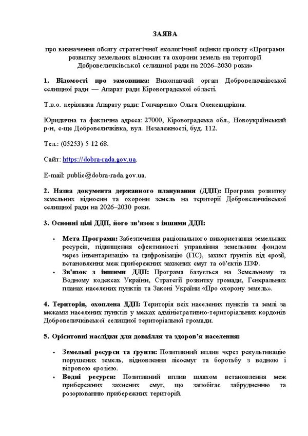 » ЗАЯВА про визначення обсягу стратегічної екологічної оцінки проєкту "Програми розвитку земельних відносин та охорони земель на території Добровеличківської селищної ради на 2026-2030 роки"