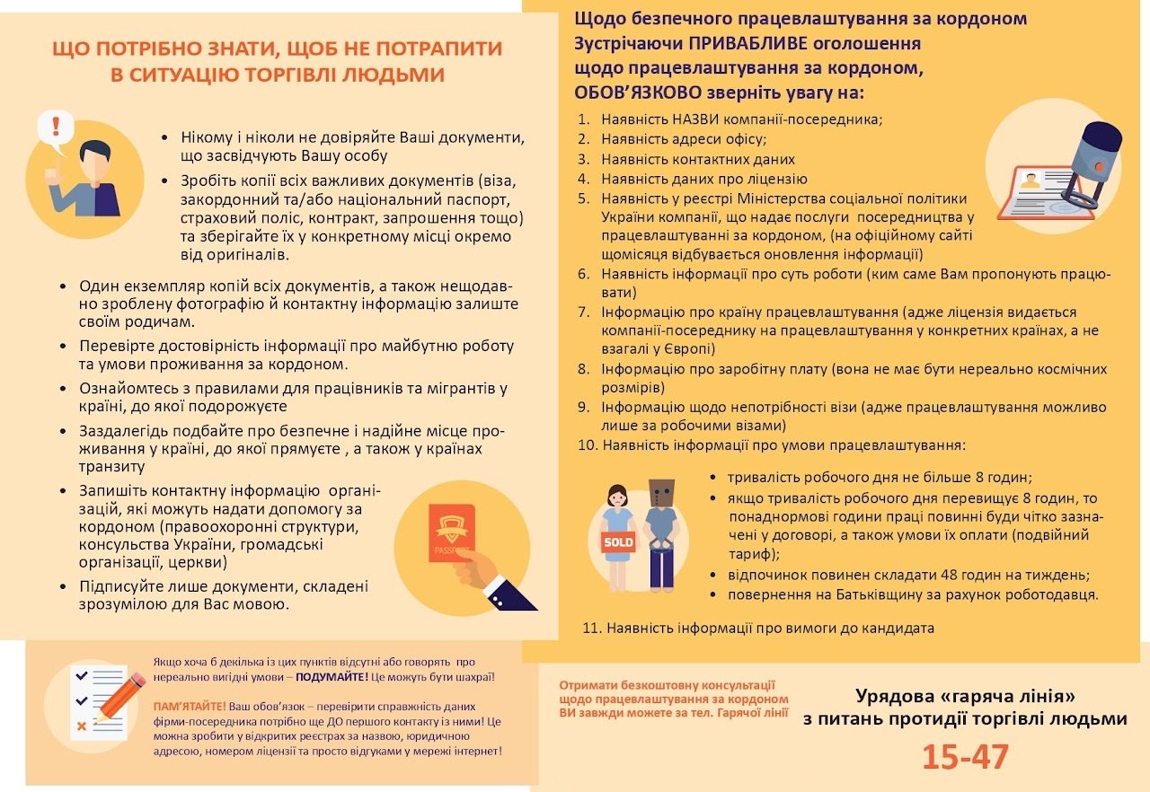 Національної гарячої лінії з протидії торгівлі людьми та консультування мігрантів: 527 (безкоштовно з мобільного), 0 800 505 501 (безкоштовно зі стаціонарного), щодня з 8:00 до 20:00.